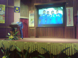 Thursday 21st August 2008 – It was a wet morning with an early downpour in the heart of Kuala Lumpur. I drove bumper to bumper to our National Library on Jalan Tun Razak. Students from SMK Bandar Baru Sentul, SMK Jalan Padang Tembak and SMK Wangsa Maju Seksyen 2 were already seated in the auditorium. The students have attended 3 days of a Cyber Camp sponsored by ExxonMobil. This morning was their closing ceremony and to conclude their event, I gave a presentation about the Angkasawan Programme titled “Suatu Pengalaman, Suatu Wawasan”. I gave an introduction about the space programme and moved on emphasizing on the need to read to expand their knowledge in line with the library’s campaign of “Bangsa Membaca, Bangsa Berjaya”. I showed some short videos of the centrifuge which got their interest. I then explained about our spaceflight medical evaluation in Russia before ending my talk. The crowd of over 200 students applauded generously and later swarmed me for autographs and photographs. It was great to be able to motivate and inspire them. I wished them well and reminded them to always work and study hard to achieve their goals.